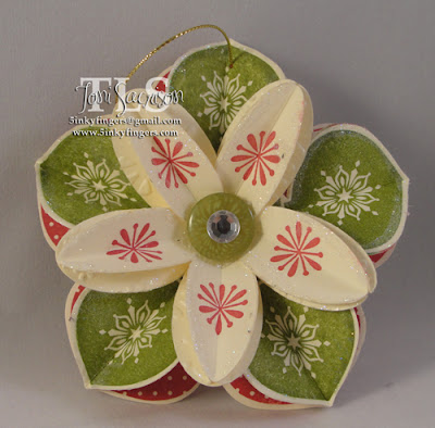 Assembly requires scoring 10 of the Rose Red ornaments and all 5 Old Olive down the middle and gluing them together in 5 groups of 4 ornaments with the un-scored ornaments forming the back pieces. This process is repeated with the ovals, ensuring that the Old Olive ornaments and the starbursts show up on top of each assembled piece. A scallop circle provides a base to glue everything together, a liberal dusting of glitter on all of the edges and a pretty olive button and a chunky crystal gem in the center finish it all off. I also added a bit of gold cord at the top to hang the ornament on the tree or tie to a package.
